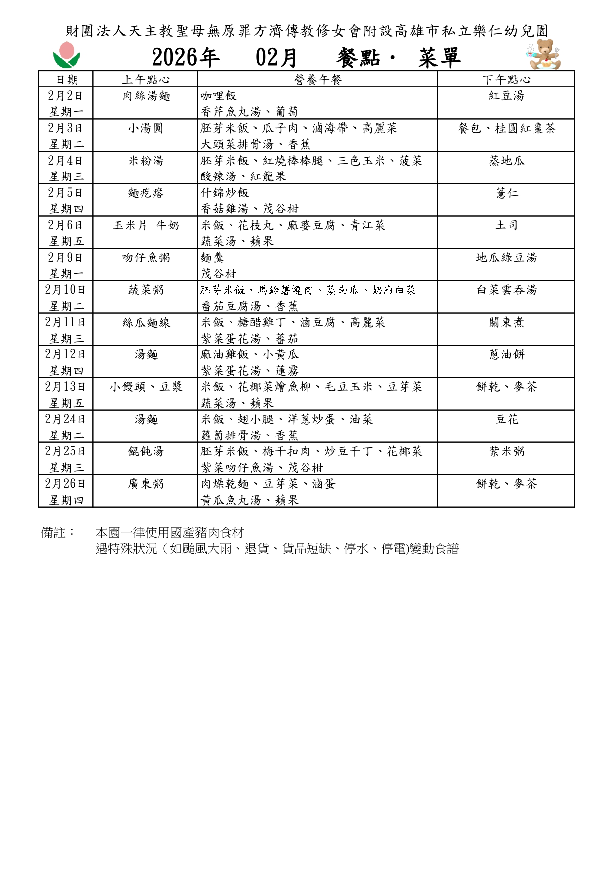 2026年2月份菜單